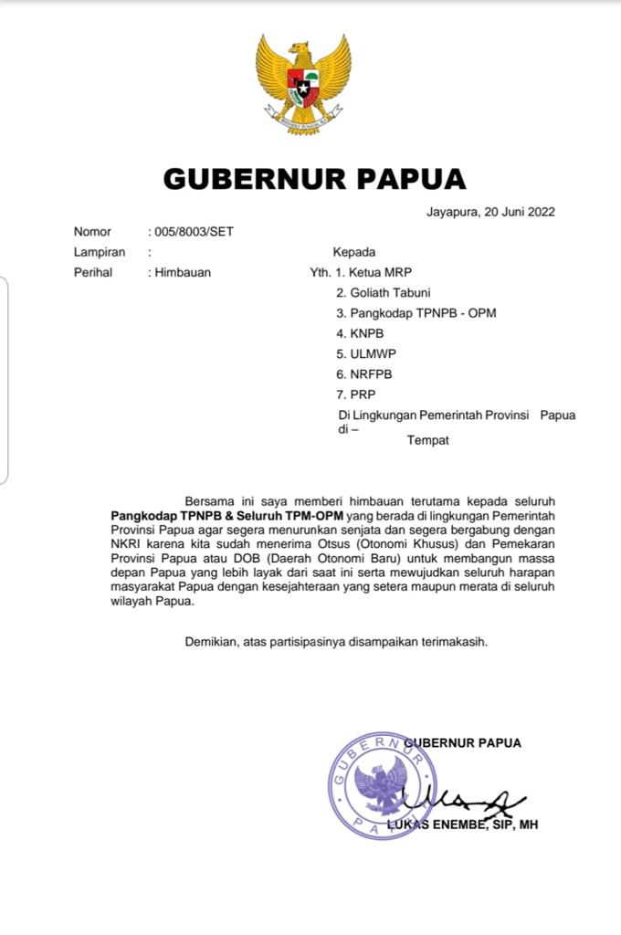 Surat himbauan dengan Nomor : 005/8003/SET itu ditujukan kepada Ketua MRP, Goliath Tabuni, Pangkopad TPNPB-OPM, KNPB, ULMWP, NRFPB, PRP, dan lingkungan Pemerintah Provinsi Papua.