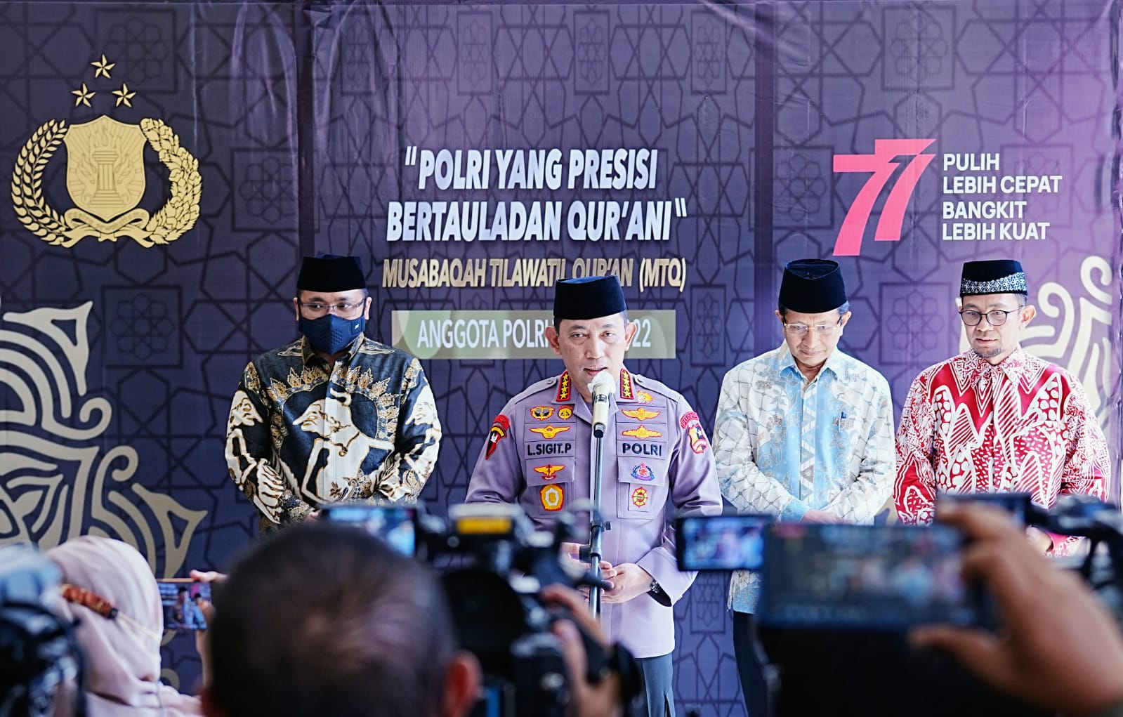 Jakarta – Kapolri Jenderal Listyo Sigit Prabowo menghadiri penganugerahan Musabaqah Tilawatil Qur’an (MTQ) anggota Polri di Auditorium STIK-PTIK, Kamis (18/82022). Kapolri menyebut sekitar 796 personel Polri dari 34 Polda mengikuti acara yang diselenggarakan dalam rangka HUT Kemerdekaan RI ke-77.