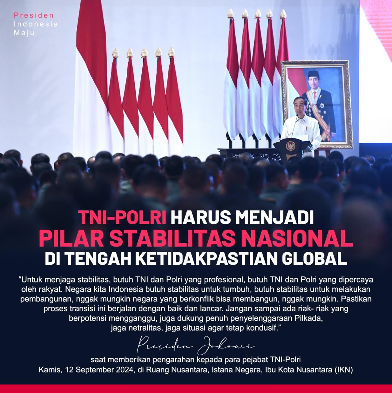 Dengan demikian, Presiden Jokowi menekankan bahwa fokus pada stabilitas nasional adalah kunci untuk menghadapi tantangan global dan memastikan pembangunan berkelanjutan di Indonesia.
