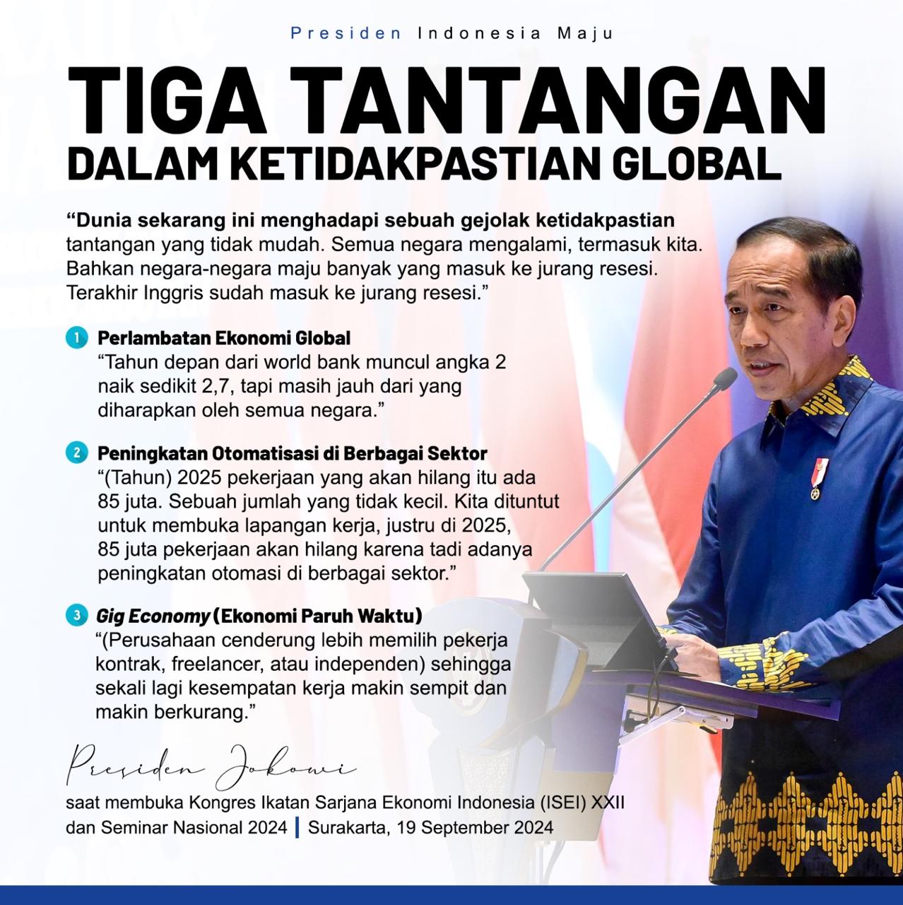 Dan terakhir, Jokowi mewanti-wanti gig economy, yaitu sistem ekonomi yang mengandalkan platform digital untuk menghubungkan pekerja lepas atau pekerja sampingan dengan permintaan pekerjaan.